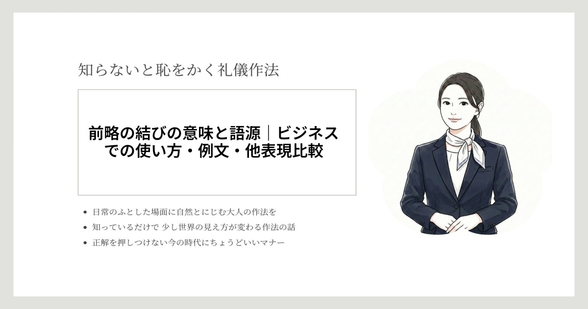 手紙やメールを送る際、「前略」と「結び」の正しい使い方を知っていますか?ビジネスでもプライベートでも、マナーを守った表現は相手への気遣いの証です。本記事では「前略」の意味と語源、ビジネスでの使い方、例文、他の表現との違い、現代での扱い方... -