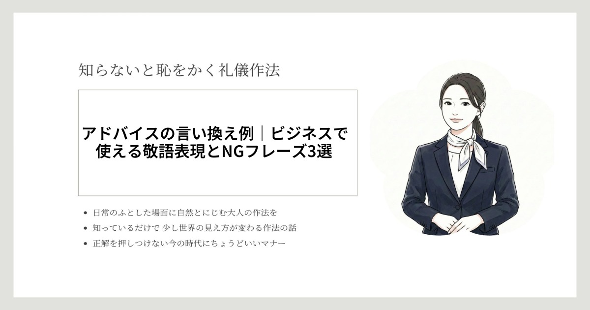 アドバイス 言い換えの中でも、最もよく用いられる丁寧なフレーズです。