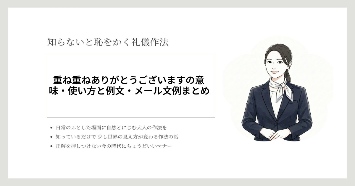 本記事では、「重ね重ねありがとうございます」の意味や正しい使い方、具体的な使用場面、例文、メールでの応用例まで詳しく解説しました。