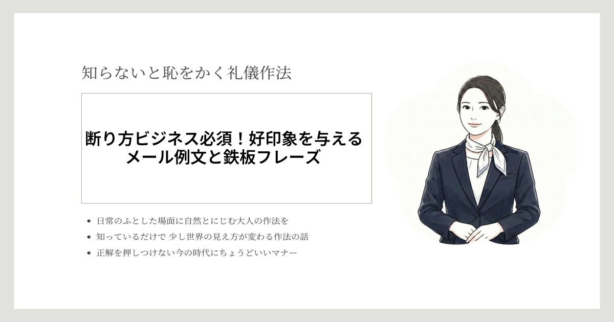 ビジネスシーンでは、時に「NO」を伝えなければならない場面があります。しかし、断り方一つで相手との関係性や今後のビジネスチャンスに大きな影響を与えることも。本記事では、「断り方」をテーマに、相手に不快感を与えず、かつ誠実で信頼を築くお断りメールのマナーや例文、書き方のポイントを徹底解説します。円滑なコミュニケーションと未来のチャンスを逃さないためのポイントを、実際のシーンに即してご紹介します。