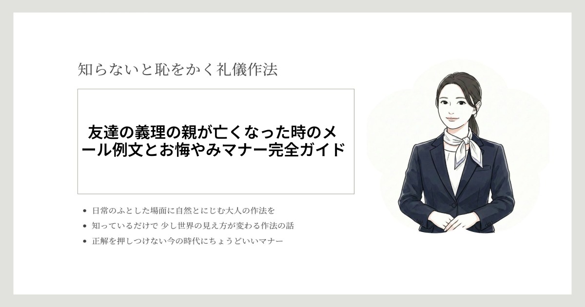 本記事では、「友達の義理の親が亡くなった時」というテーマで、メールによるお悔やみの伝え方や注意点、具体的な文例、そして知っておきたいマナーを分かりやすく解説します。