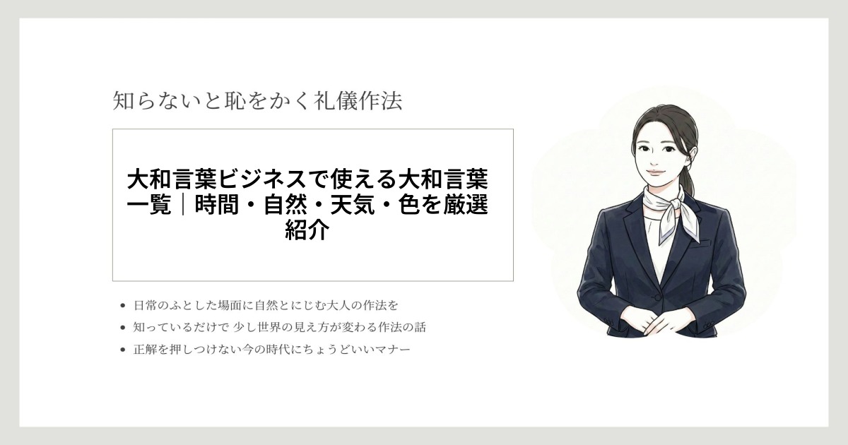日本らしい繊細な心遣いを表現できる「大和言葉」。現代ビジネスシーンでも大和言葉を使うことで、相手に柔らかく上品な印象を与えることができます。この記事では、時間や自然、色、日常会話からビジネスまで、実際に使える大和言葉の一覧を例文付きでご紹介します。「大和言葉」を知りたい方は必見です。ぜひ、日々のコミュニケーションや礼儀作法に取り入れてみてください。