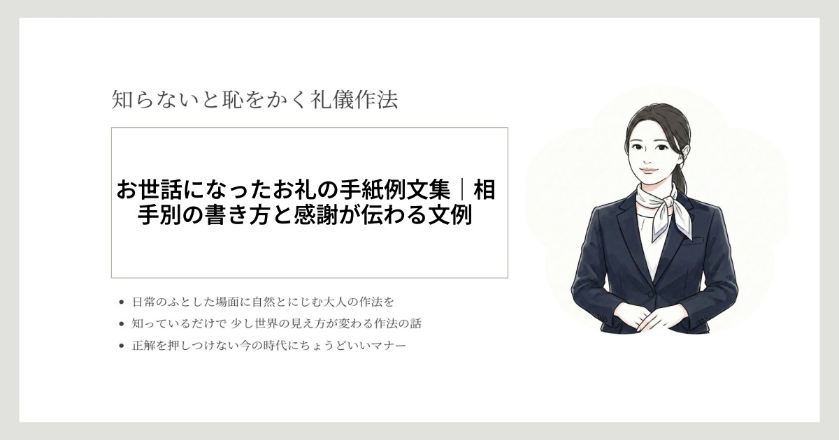 人とのつながりや温かな心遣いに、きちんと感謝を伝えたい。そんな時に役立つのが「お世話になったお礼の手紙例文」です。ビジネスでもプライベートでも、礼儀正しく気持ちを伝える手紙は、相手への敬意と信頼関係を深め、より良い関係構築に欠かせません... -