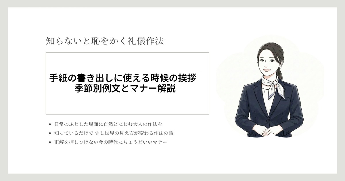 手紙の書き出しは、日本の伝統的な礼儀や気配りを表す大切なポイントです。「手紙」に悩む方も多いですが、正しい時候の挨拶や季節の表現を用いることで、相手に誠実な印象を与えることができます。本記事では、ビジネス・プライベートどちらにも使える時... -