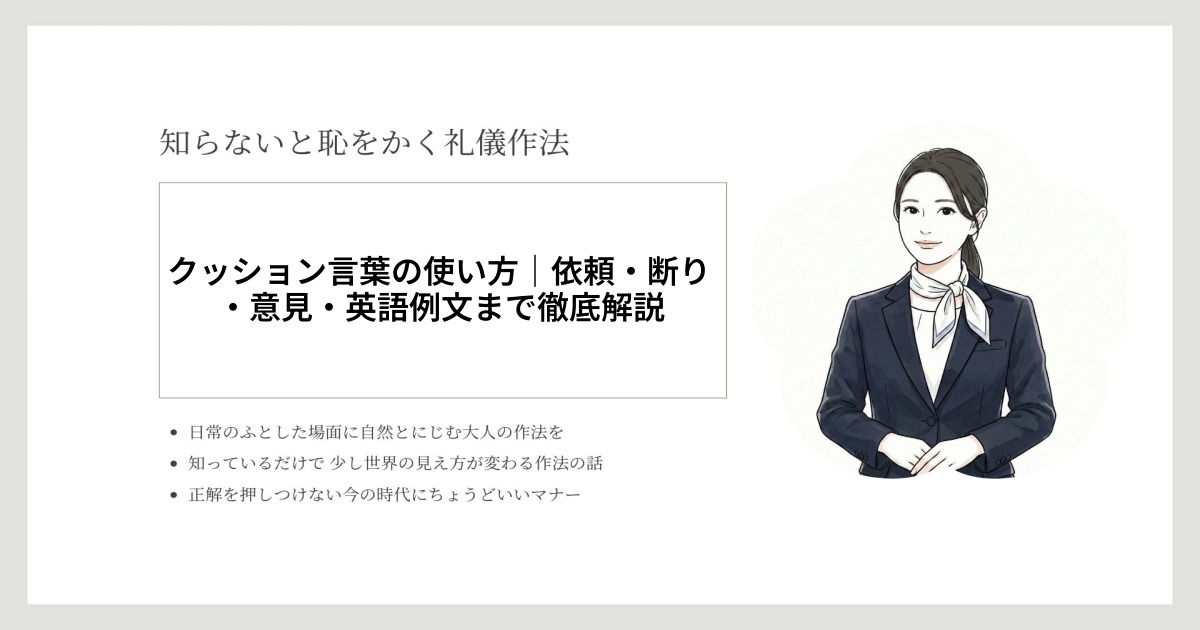 社会人として信頼を築くためには、言葉選びの細やかな配慮が欠かせません。その中でも「クッション言葉」は、ビジネスでも日常でも相手とのコミュニケーションを円滑にし、円満な関係を築くための大切なマナーです。本記事ではクッション言葉の意味や役割... -